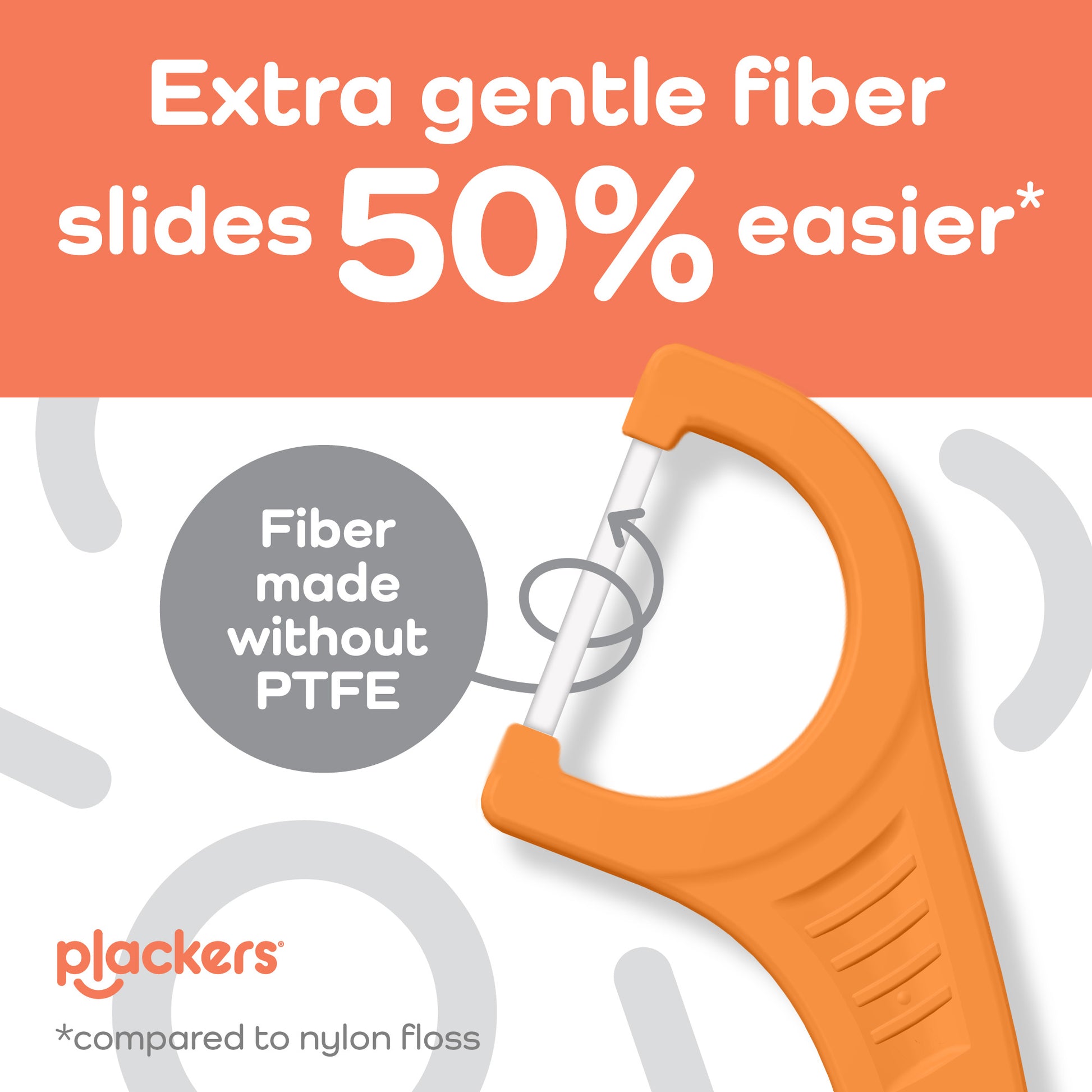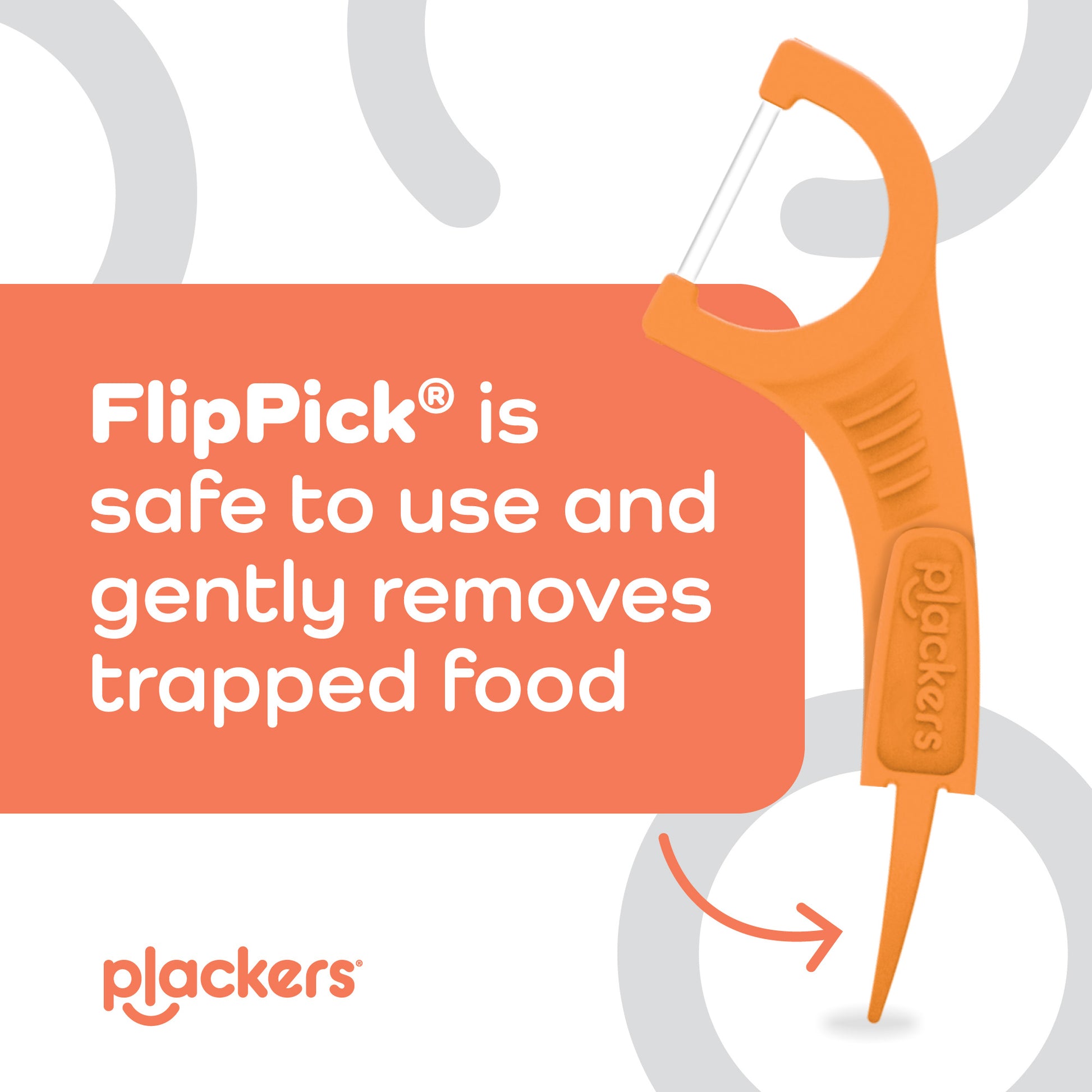 Plackers® Gum Defense Floss Picks, infused with Vitamin C, effectively remove plaque for healthier gums. GentleSlide® fiber is made without PTFE and it slides 50% easier* between tight teeth and is specially designed for sensitive teeth and gums. Unlike traditional end picks that remain exposed, Plackers® FlipPick® stays tucked away until you need it, reducing the risk of accidental pokes and discomfort. Enjoy an energizing tangerine flavor in every floss. Packaged in resealable bags. Daily flossing helps prevent gum irritation and maintain healthy teeth**. Healthy habits start with Plackers®.